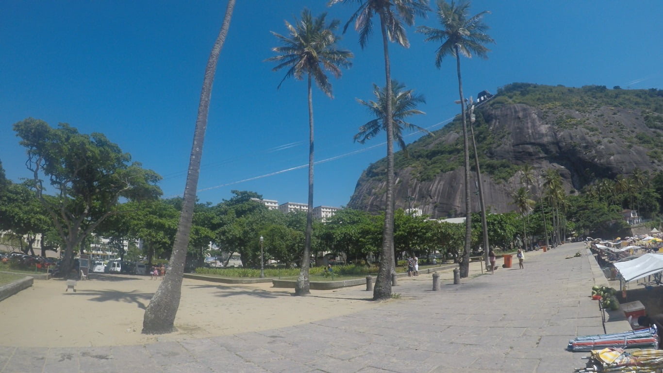 Há a possibilidade de fazer esportes radicais. Um é a canoagem a partir da praia. Mas o mais emocionante é a escalada. Você pode contratar uma aula ali para escalar uma das pedras da região ou então o próprio costão do Pão de Açúcar. É uma das vistas mais bonitas. Uma panorâmica sensacional, pegando o mar aberto, Niterói e um pedaço de Copacabana.